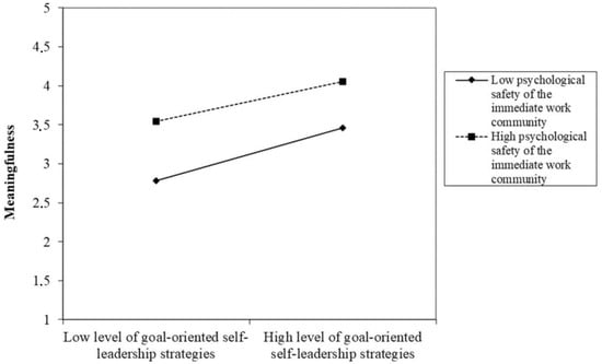 Graphical representation of the significant two-way interaction (see Figure 2) was done using the standardized regression coefficients of the regression lines for employees high (1 SD above the mean) and low (1 SD below the mean) on psychological safety of the immediate work community. Figure 2 shows that high level of goal-oriented self-leadership strategies was related to greater experience of meaningfulness, but psychological safety moderated this effect: in a situation where employees used a lot of goal-oriented self-leadership strategies, high psychological safety of the immediate work community further strengthened its relationship to meaningfulness. That is, in this situation, the meaningfulness of work was the highest. However, the beneficial effect of psychological safety of the immediate work community on meaningfulness was even more marked in a situation where employees only made small use of goal-oriented self-leadership strategies.