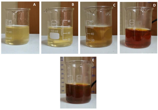 Synthesis of AgNPs at different time intervals (A) 15 min, (B) 30 min, (C) 1 h, (D) 1.5 h, and (E) 2 h. (A–E), the colour of the solution turns from a pale yellow to colour to a dark brown colour. The colour is darkest at (E), indicating the presence of AgNPs.