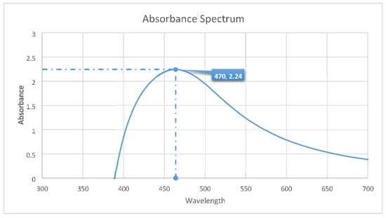 Even though the color change can indicate the presence of nanoparticles in the solution, they can only be confirmed by performing UV spectral analysis. Here, we used modern spectrophotometers to correct for the high concentration effect to varying degrees, and therefore it can produce a linear standard curve up to 2.0 Abs units or more. Analyzing the absorbance peak, we can confirm whether AgNPs are present or not. This is because the SPR of the AgNPs determines their optical, physical, and chemical properties. In the case of AgNPs, the absorbance should peak between 400 and 500 nm [7,37]. This peak in absorbance is called their SPR value. Correlating the AgNP’s plasmonic properties with their morphology is a fast and easy way to monitor the synthesis by UV–visible spectroscopy [42]. As we can see from Figure 2, the absorbance peaks at 470 nm, which means this is the SPR value of the nanoparticles we were able to synthesize. This peak is more extensive than our reference value [7], which might be because different plants work differently to reduce AgNPs. That is why nanoparticles synthesized using diverse plant samples will have varieties in their shapes and sizes according to the models used as a bioreactor. Broader peaks indicate larger-sized particles, while smaller particles will form more distinct and well-defined peaks during the UV spectral analysis [38,43].
