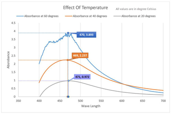 The shape and size distribution of AgNPs is typically measured and visualized using electron microscopy techniques, such as TEM and SEM, or by X-ray diffraction (XRD) studies [44,45,46]. The SPR band or absorption spectra can be obtained using UV-Visible spectroscopy, where the wavelength corresponding to peak absorbance (λmax) reflects the size of the AgNPs. When reaction temperature increases, the absorbance peak increases with an increase in reaction rate, resulting in smaller-sized nanoparticles [20,47]. The temperature enhances the rate of reduction, which results in decreased reaction time. Therefore, a rise in temperature may lead to smaller size AgNPs. The increase in temperature also increases the kinetic energy of molecules, which increases the consumption of silver ions. Thus, particle size growth and formation of uniform-sized AgNPs are less likely [20,48].