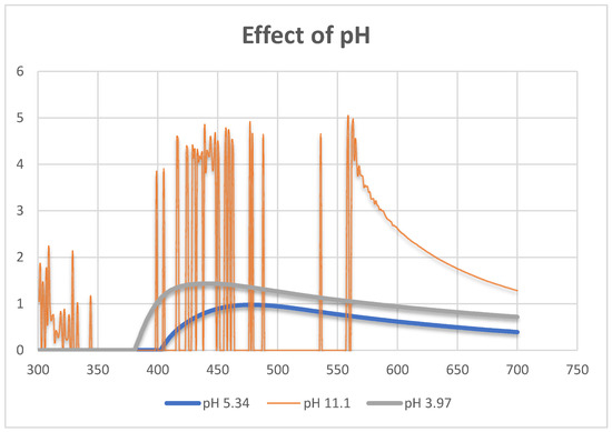 Absorbance spectrum of AgNPs at different pH. For a pH of 3.97, the peak was observed at 435 nm. At a pH of 11.1, a random absorbance pattern is observed.