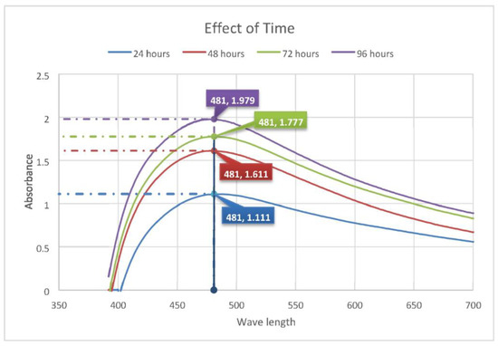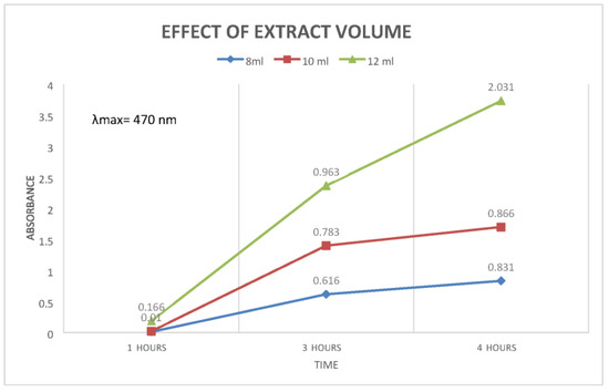 Effect of plant extracts volume on the reaction time. At 3 h, the sample containing the highest quantity of plant extract showed the highest absorbance, recorded at 0.963 at λmax calculated to be 470 nm. The lowest absorbance, 0.616, was shown by the lowest volume of plant extract, 8 mL. At the 4-h mark, the highest was for, once again, the 12 mL of plant extract, showing absorbance of 2.031. The lowest point observed was for the 8 mL plant extract showing absorbance of 0.831.