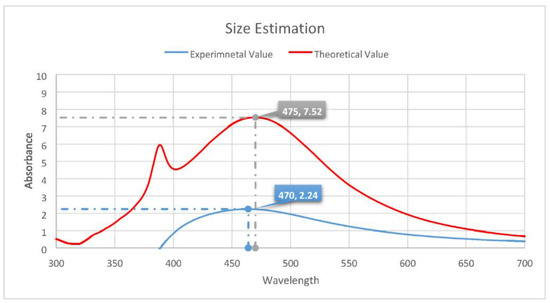 Estimating the size of the AgNPs. For the experimental value, the absorbance was revealed to be 2.24 at a wavelength of 470. This is compared with the theoretical value, with an absorbance of 7.52 and a wavelength of 475, to estimate the size of the AgNPs formed.