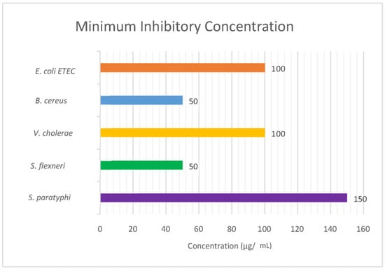 Results of the minimum inhibitory test. S. paratyphi required the highest concentration of AgNPs at 150 µg/mL, while the lowest amount, 50 µg/mL, was required by B. cereus and S. flexneri. E. coli (ETEC) and V. Cholerae required the same concentration of AgNPs at 100 µg/mL.
