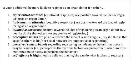 In terms of explaining the past decision to register, IBM was useful. By way of review, the constructs of attitudes and perceived norms were statistically significant predictors of past registration. Two factors outside the IBM (i.e., salience and knowledge) were also statistically significant predictors of a past decision to register. When we combined and analyzed all statistically significant predictors, young adults with more positive direct attitudes were 1.5 times more likely to be registered than those with negative direct attitudes. In future health communication campaigns, public health specialists and transplant advocates should emphasize both the cognitive and affective components of attitudes while emphasizing the benefits of registering as a donor.