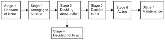 We used the Integrated Behavioral Model (IBM) and the Precaution Process Adoption Model (PAPM) as the framework for our study. The IBM was designed to help explain and predict behavioral intentions by assessing the relative impact of attitudes, perceived norms, and personal agency [8]. Similar to the Theory of Reasoned Action/Planned Behavior that preceded it, IBM proposes that attitudes drive human behavior and that behavioral intention is the primary determinant of behavior [8]. Figure 1 depicts the IBM constructs and how they apply to this study. There are also four factors outside the IBM that influence behavior directly without working through the constructs of the model: (1) Knowledge and skills to perform the behavior, (2) Salience of the behavior, (3) Environmental constraints, and, (4) Habit [8]. Obviously, habit and environmental constraints are not relevant in the current study, but we did assess knowledge and salience. The PAPM was used to describe young adults’ stage of readiness to register as organ donors. The PAPM categorizes people in one of seven possible stages of readiness to adopt or perform a positive health behavior (See Figure 2) [8].