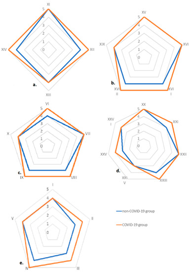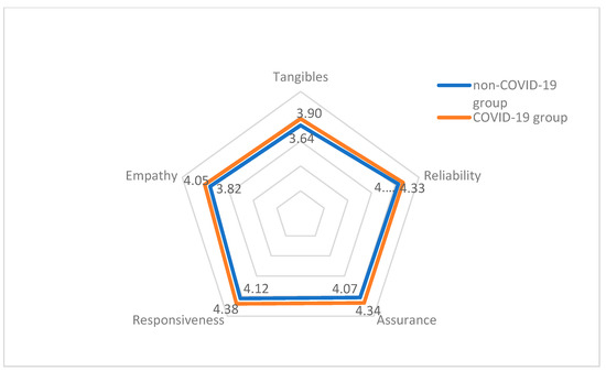 Among each dimension, there were several questions: responsiveness (5), assurance (5), reliability (4), empathy (7) and tangibility (5). Answers to each question were compared between the COVID-19 and non-COVID-19 group. The Man–Whitney U test showed a statistically significant difference when all answers among five dimensions of service providers’ quality were compared between the COVID-19 and non-COVID-19 group (p < 0.001), except in one question (dimension tangibility, see Appendix A, Table A2, D2.1) (p = 0.417). However, answers to the other four questions for dimension tangibility were significantly different between the two groups. The respondents in both groups accorded the highest priority to responsiveness, followed by assurance, reliability, empathy and then tangibility. Responsiveness was significantly more assessed in the COVID-19 group: 4.38 vs. 4.12 in the non-COVID-19 group (Figure 1a). There was also a significant difference between the two groups in assurance dimension, with a median mark of 4.34 in the COVID-19 vs. 4.07 in the non-COVID-19 group (Figure 1b). There was a significant difference observed between two groups in the reliability dimension, with a mean value of 4.33 in the COVID-19 vs. 4.13 in the non-COVID-19 group (Figure 1c). In the COVID-19 group, respondents reported more empathy in the COVID-19 group (4.05) compared to non-COVID-19 respondents (3.82) (Figure 1d). Finally, in the COVID-19 group, healthcare workers felt more tangible (3.90) compared to in the non-COVID group (3.64) (Figure 1e). Tangibility was identified as the most vulnerable quality dimension of a healthcare setting in this study. The radial diagram in Figure 2 presents a comparison of both groups regarding all five dimensions.