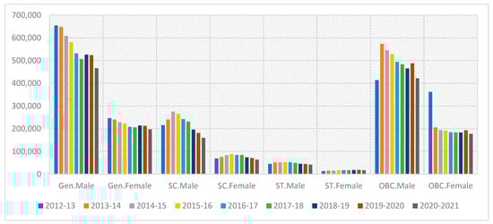It is clear from Figure 1 that there was a decrease in the enrolment of women in engineering in 2020–2021 from 2019–2020. Among the main reasons for such a decrease may be COVID-19, which has caused disruption in the economy and resulted in the loss of employment and earnings for many households. Consequently, COVID-19 has also resulted in dislocation and return migration for many households. In India, a daughter’s engineering education is not seen as an expenditure but an investment because engineering brides are more in demand in the marriage market. Traditionally, marriage is arranged by parents in India [34]. Further, the plus-two examination, a prerequisite to join graduate engineering programs, was delayed, which may have caused mental stress for students. Additionally, though there are provisions for educational loans from the commercial banks, the COVID-19 pandemic has adversely affected the financial health of the banking system as well and that channel may have also partially dried up or become critical in terms of their usual banking services [35].