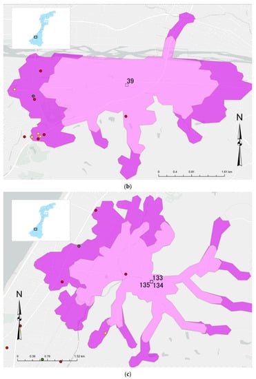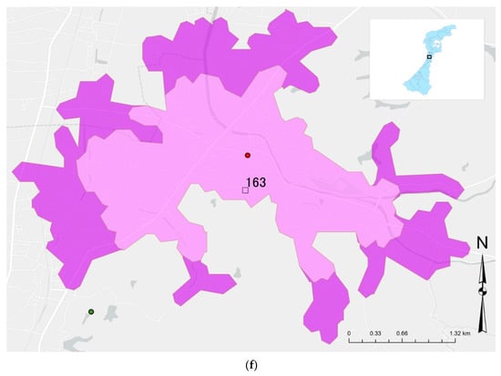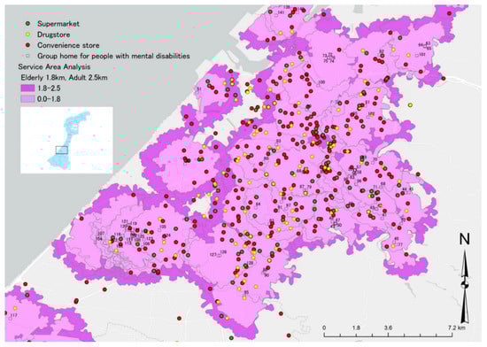 2.6. Service Area Analysis of Distance from GHs to SPs to Obtain Daily Necessities
