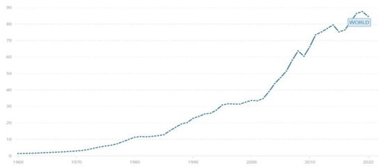 - World Bank. World GDP (Current US$). World Bank National Accounts Data, and OECD National Accounts Data Files. 2021. Available online: https://data.worldbank.org/indicator/NY.GDP.MKTP.CD?end=2020&start=1960&view=chart (accessed on 22 August 2021).