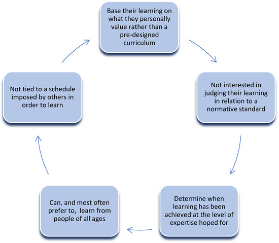 A psychological theory that regards the learning process as internally regulated [8,9], self-directed learning (SDL) is based on what the learner personally values, relating to other learners as also self-directing their learning [10]. When this learning takes place in communities based on consensus decision making by finding a time and place to do what each learner values, the self-direction evolves from an individual approach to learning to a way of organizing social interactions when learning [11].