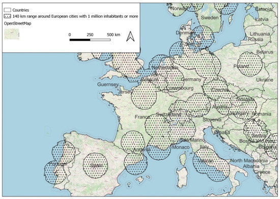 The results consist of maps that depict hypothetical exposure to nuclear attacks. The results only show exposed areas and do not calculate casualties or differentiate certain population groups. This is because the study’s main purpose is to inform about the spatial extent of a nuclear attack and not to provide any details on casualties that could be misused as a form of information to identify an optimal distribution of attacks. The first map shows an attack scenario for Central Europe. Major cities with more than 1 million inhabitants are selected, and the buffer circles of impact from cruise missiles are shown. The results show that large areas of Central Europe would be devastated by the combined effects of the fireballs, blast waves, thermal and other radiation, and fallout (Figure 1).