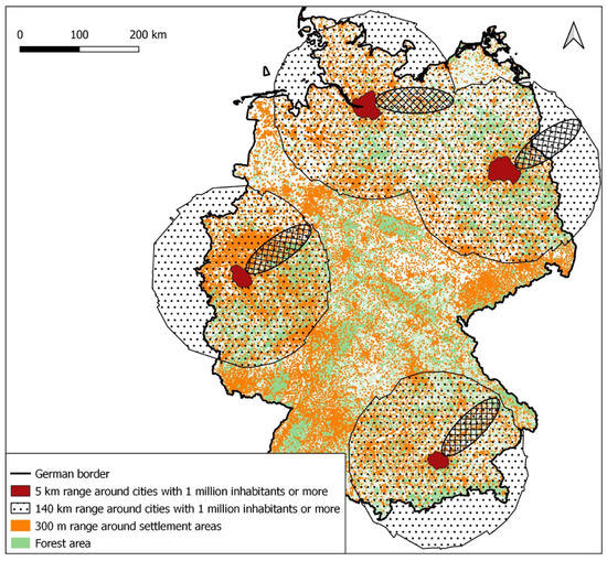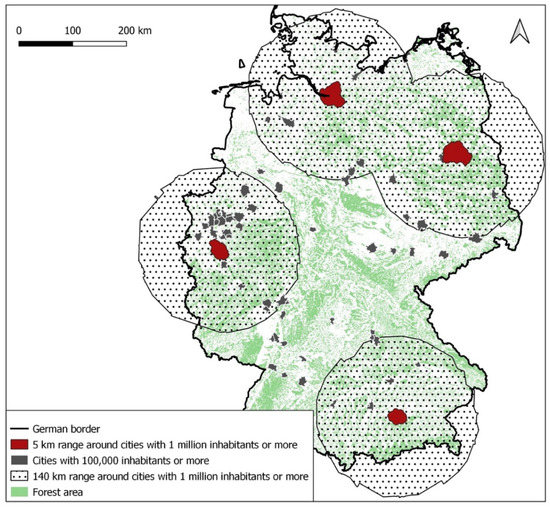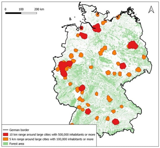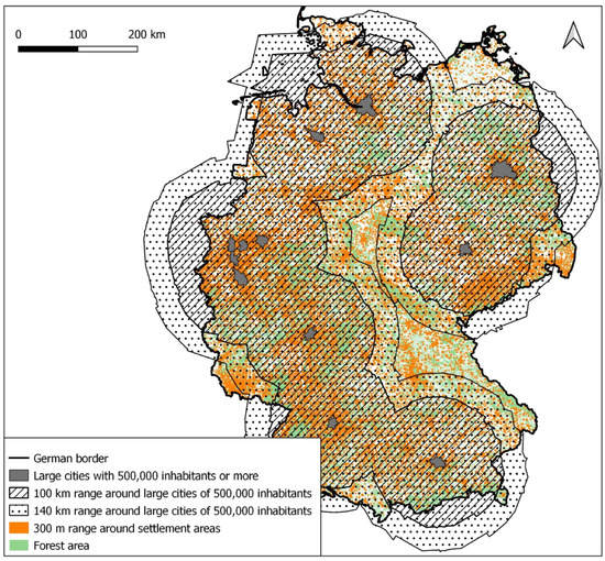 Forest areas in Germany outside of the largest cities exposed to risk of attack.
