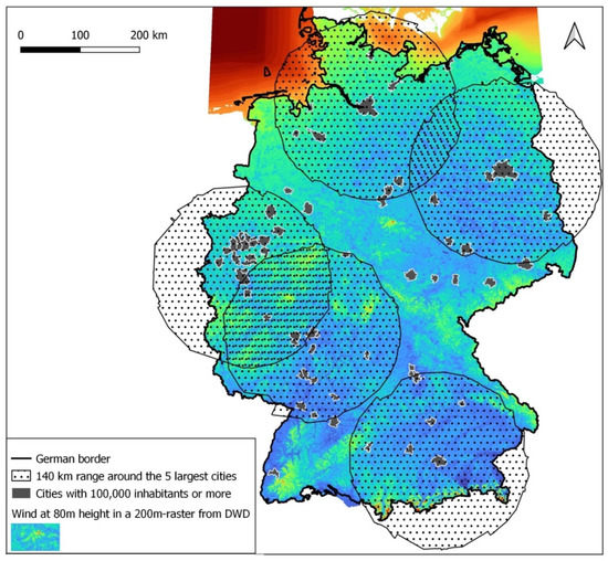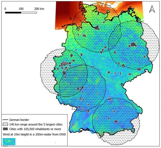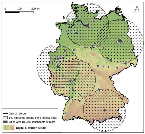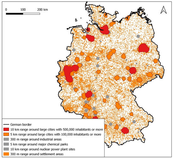 The wind direction, which in Germany is predominantly from the southwest, makes it likely that areas in the northeast would be affected by fallout radiation risk. Again, it must be warned that wind directions in Germany change, and therefore, the buffer circles must be used to identify all areas potentially exposed. The map also shows additional settlement areas and industrial areas with a 300 m buffer, as in the case of a war unfolding over longer time periods, other settlement areas could also become targets of smaller bomber-based missiles. Again, it is unrealistic that all settlement areas would be bombarded with such types of missiles. The map intends to identify areas that could potentially be exposed and considered for demands of shelter within urban areas and rural areas outside of the vicinity of settlements. The map also shows that overall, many smaller-size cities of Germany would be affected by the immediate impacts on the four major cities and the fallout radiation risk. To compare the selection of four cities in Germany with another scenario, another map is shown. The map shows large cities in Germany with 500,000 or more inhabitants (Figure 4).