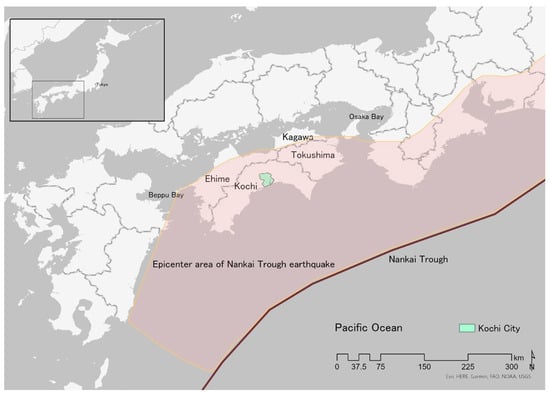 The target city is Kochi City, Kochi Prefecture, in the Shikoku region of Japan. Kochi City is located on the Pacific coast and has a population of 324,191 (Figure 1) [37]. A Nankai Trough earthquake may have a seismic intensity of 7 in the area between Shizuoka Prefecture and Miyazaki Prefecture, and will likely cause a large tsunami of 10 m or more [38,39]. The Nankai Trough has an average depth of 4000 m and a depth of 150–200 km off the coast of Kochi Prefecture, and has caused several earthquakes of magnitude of 8 or more at intervals of approximately 100 years [38]. If a Nankai Trough earthquake occurred, it is estimated that the ground in Kochi City would subside 1.5 m and approximately 2800 hectares of land would be inundated for a long time [4].