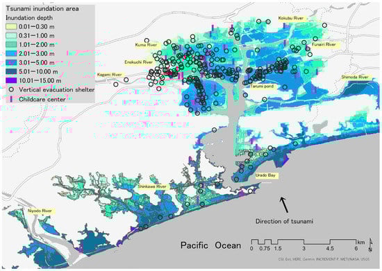 In Japan, childcare centers (CCs) care for children aged 0–6 years. The Child Welfare Act requires CCs in Japan to conduct evacuation drills once a month [7]. A study of evacuation behaviors during the Great East Japan Earthquake found that children aged 3–5 years were instructed to walk side by side under the guidance of a teacher, and children aged 0–2 years were carried piggyback or in strollers for multiple passengers. Local support for evacuation was also provided [8]. Analysis by Akizuki et al. of evacuation behaviors during the Great East Japan Earthquake suggested that during tsunamis, it is impossible to prevent local residents from trying to save children in CCs, even though residents know they are at risk from the tsunami. Therefore, CCs should be located higher than the tsunami flood levels [9]. In the areas affected by the tsunami caused by the Great East Japan Earthquake, construction work is being carried out to raise the land and residents are moving to higher ground. However, there are many residents and CCs in areas that were not affected by the Great East Japan Earthquake but that are predicted to be affected by tsunamis.