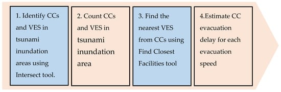 We calculated the distance from each CC to the nearest VES, the median (range) walking time, and the number and percentage of CCs that would evacuate toward the tsunami. With reference to the Kochi Prefecture Disaster Prevention Map [43], we calculated the number and percentage of CCs that are not expected to evacuate within the time it takes for a 0.3 m tsunami to reach them. Kochi Prefecture has published a map of the arrival time of a 0.3 m tsunami, which states that it will be impossible for residents to evacuate on foot and asks residents to evacuate quickly [33]. However, setting the arrival time of a 0.3 m tsunami has important limitations. It does not consider the damage risk until the tsunami reaches 0.3 m. Therefore, it should be noted that there is a risk of disaster before reaching 0.3 m of inundation, and a tsunami may go on to have flow depths that greatly exceed 0.3 m. For GIS analysis, ArcGIS Pro 2.8.0 from Esri (California, CA, USA) was used.
