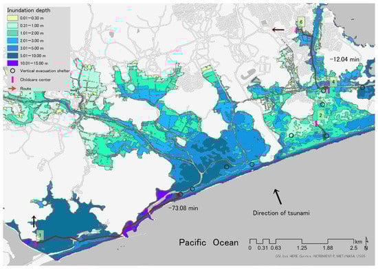 In this study, we use the term inundation depth, also termed flow depth in some studies, to refer to the depth at which the (usually dry) ground is covered with water by the tsunami. The flow and approach direction of tsunamis are not considered [32]. In Japan, local governments use hazard maps to indicate the depth of inundation caused by tsunamis and call on residents to evacuate early [33].