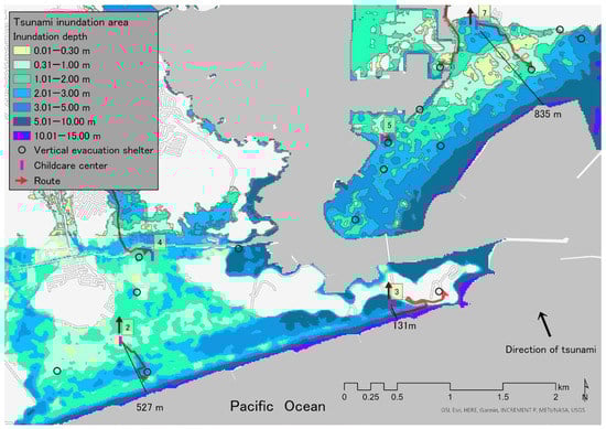 To enable children in CCs to quickly evacuate in the event of an earthquake-generated tsunami, it is necessary to identify the nearest non-flooded area and the shortest route to that location, and to formulate a carefully considered evacuation strategy. Above all, it is important that CCs near the coast have tsunami evacuation strategies to save children’s lives and avoid damage to the CC. There have been reports of tsunamis caused by earthquakes around the world. When a tsunami occurs, the epicenter is important, but tsunami damage is not limited to the immediate location or by the size of the earthquake. The rise in sea level due to global warming and urban development in low-lying coastal areas both have effects [14,15]. Tsunami evacuation strategies for CCs, where children spend long hours during the day, should be considered in all coastal areas of the world.