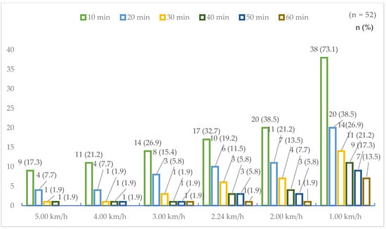 Figure 7 shows the estimated number of late evacuations for each tsunami arrival time according to differences in walking speed. If a 0.3 m tsunami arrived in 10 min, assuming a base walking speed of 2.24 km/h, 17 CCs (32.7%) would have late evacuations. The number of late evacuations for speeds faster than the base walking speed would be 14 CCs (26.9%) at 3.0 km/h, 11 CCs (21.2%) at 4.0 km/h, and 9 CCs (17.3%) at 5.0 km/h. The number of late evacuations for speeds slower than base walking speed would be 20 CCs (38.5%) at 2.0 km/h and 38 CCs (73.1%) at 1.0 km/h.