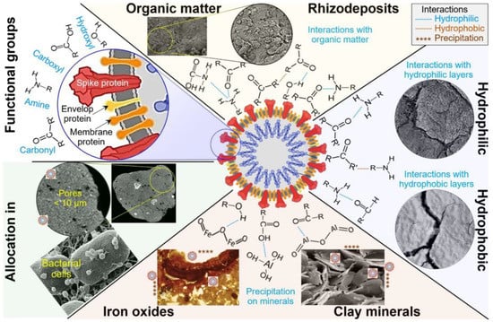 Phage virions are passively distributed in soils due to their smaller size and hydrophobicity, and are present across all soil compartments []. Phage virions adsorb on soil at a rate of 1.68 × 106–9 × 108 g−1 soil []. SARS-CoV-2 could potentially be distributed in soil compartments by passive transport with waste or manure applications, irrigation, or tillage, or adsorb on mineral or OM surfaces due to the positive charge on the SARS-CoV-2 surface (as a consequence of increased cation exchange capacity) []. Thus, OM and mineral surfaces can serve as sites (Figure 2) where free-living bacteria may encounter infectious viruses—a similar phenomenon (2–37% bacteria killed by virus lysis) was observed during organic particle flux in water []. This might be a more serious problem in the rhizosphere, where root-released rhizodeposits provide OM for virus attachment and protection. Under drought, microbial abundance commonly decreases, and viruses occupy the thin soil layer due to hydrophobic interactions. Thus, the coupling of drought and frequent SARS-CoV-2 loading could lead to exacerbated habitat degradation.