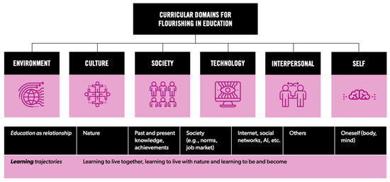 The report seeks to separate flourishing aims and manifestations into those that support the conditions of flourishing and those that provide the capacities for flourishing, stating that ‘The promotion of flourishing should be multi-scalar, and advance from micro to macro, that is, from the level of the individual student and teacher to that of policy, and vice versa’—with relationship as core to the whole process. It identifies a number of curricular domains that underpin the process (Figure 1).
