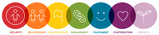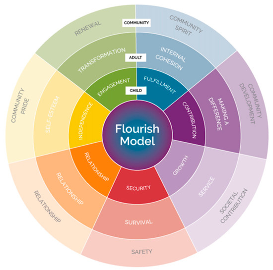 The Flourish Model was initially inspired by the Seven Levels of Consciousness Model put forward by leadership expert Richard Barrett [39] which was itself an extension of Abraham Maslow’s hierarchy of needs [40]. The Model proposes that the dynamics of natural systems are reflected in seven core aspects to human flourishing which need to be fully acknowledged and incorporated for us to be supported in becoming the best version of ourselves. These are the energetic drivers of human motivations and development that invite us to actively engage with our environments and they are further shaped and defined by the unique experiences that we all have as individuals. They reflect our physical, emotional, mental, and spiritual needs as human beings.