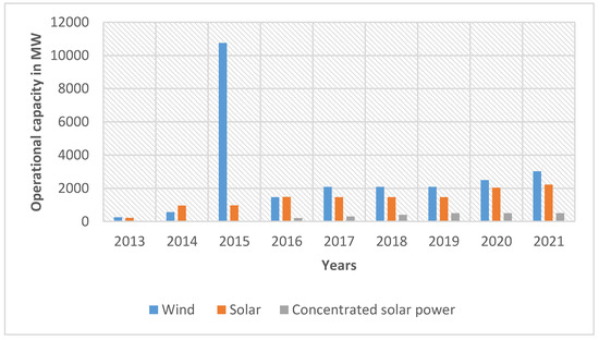 Operational capacity of solar, wind and concentrated solar power energy from 2013 to 2021. Adapted from [8].