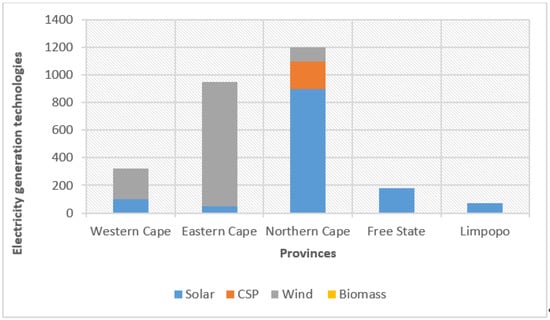 Figure 2 compares the Eastern Cape and other provinces’ electric generation by different technologies, namely solar PV, wind, concentrated solar power, biomass energy and hydropower (pumped water storage).