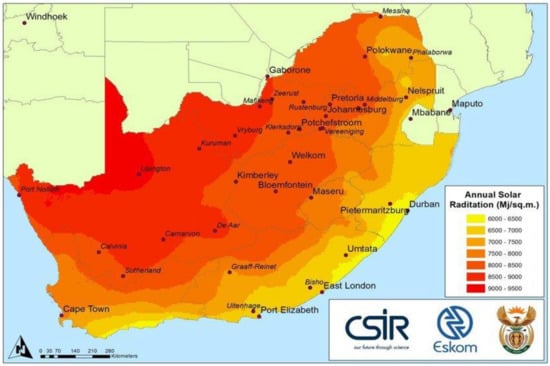 - Fluri, T.P. The potential of concentrating solar power in South Africa. Energy Policy 2009, 37, 5075–5080. [Google Scholar] [CrossRef]
