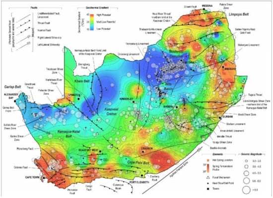 Geothermal energy technologies involve the use of either heat from the earth or coolness from the ground. Heat sources for producing electricity through geothermal technology range from shallow ground heat, hot water beneath the earth’s surface and hot rocks beneath the earth’s surface to very high temperature molten rock called magma [28]. The advantage of using geothermal energy in South Africa is that it is renewable. It was also discovered that there is a potential for geothermal energy in Cradock in the Eastern Cape. Rather than using fossil fuels such as coal, geothermal energy can be an alternative for the Eastern Cape. The disadvantage is that it is costly to construct new power plants for geothermal energy when it is already difficult to maintain the existing thermal power plants in South Africa. Figure 4 illustrates the areas with a potential for geothermal energy.