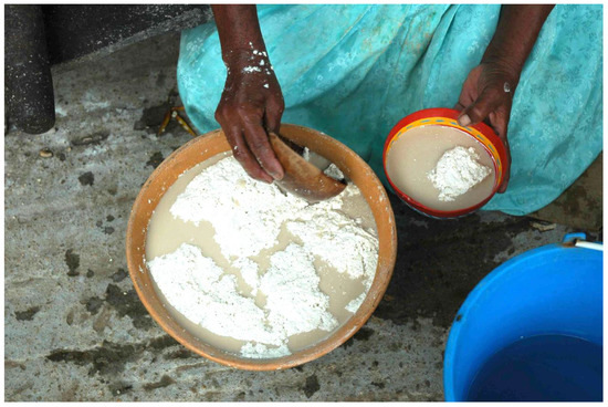 Tejate preparation is labor- and skill-intensive. Today, women (exclusively in our experience and in published sources) in Zapotec CV communities prepare tejate using maize nixtamalized with wood ashes (cuanextle), and a toasted and ground mixture of cacao rojo (Theobroma cacao L.), rosita de cacao blossoms (Quararibea funebris (La Llave) Vischer (Bombacea)), mamey seed or pixtle (Pouteria sapota (Jacq.) H.E. Moore & Stearn), and, in some areas, cacao blanco (T. bicolor Humb. & Bonpl.), cocoyul (Acrocomia aculeata (Jacq.) Lodd. ex Mart.), or other more widely known ingredients such as coconut, peanut, or walnut [33]. Tejate is served in a jícara, a decorated, bowl-shaped vessel made from Crescentia cujete L. or C. alata (Figure 1).