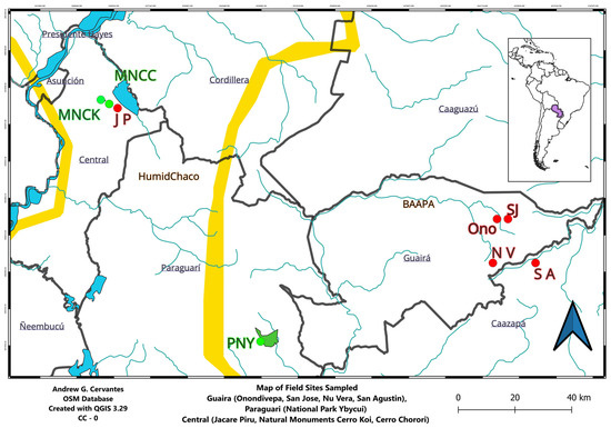 The six transects in PNY of the Paraguarí department were inventoried in July 2021, including a range of forest types, rocky outcrops, waterfalls and riparian vegetation, and gallery forests with a total area of over 5000 ha [70,74,75].