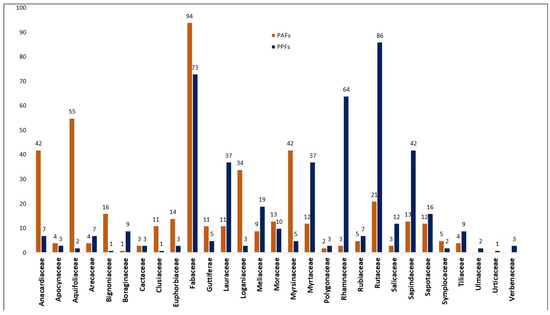 Nine hundred and three individuals were registered, representing 35 families, 82 genera, and 92 species. The most diverse botanical family across all land tenure regimes was Fabaceae with fourteen species, followed in decreasing order by Myrtaceae (eight species), Rutaceae (seven species), Sapindaceae (five species), and Lauraceae, Meliaceae, and Moraceae (four species each). Highly represented families registered in PPFs were Rutaceae, Rhamnaceae, and Sapotaceae families. While in PAFs, the most represented families were Arecaceae, Anacardaceae, and Myrtaceae, Figure 2.