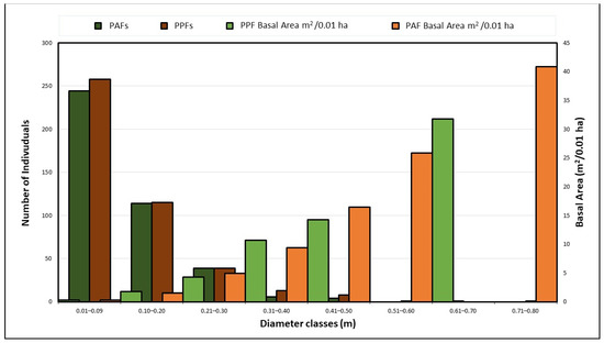 Diameter classes and basal area for all samples in PAFs and PPF.