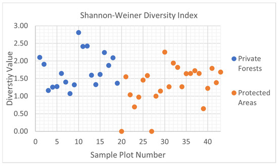 Shannon–Weiner Diversity Index values for each plot in study. Private forests ranged from 1.0 to 2.9. Protected areas ranged from 0.0 to 2.3.