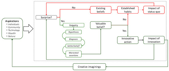Humans receive raw sensory input—“impressions”—of the world around them and, after cognitively processing them, develop “expressions”, the stories and narratives that people build for themselves and others to help make sense of the patterns of regularities in their world [13]. Expressions are stories about the current state of the world, whereas “creative imaginings” (Figure 2) are about the future, stories that Rorty [14], p. 263, saw as addressing the question “Will human life be better in the future if we adopt this belief, this practice, or that institution?”.
