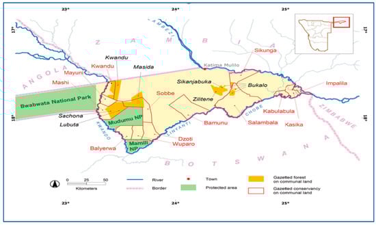 - Mendlesohn, J.; Roberts, C. Profile of Caprivi; Directorate of Environmental Affairs: Windhoek, Namibia, 1997. Available online: https://www.raison.com.na/sites/default/files/Profile%20of%20Caprivi.pdf (accessed on 14 August 2023).