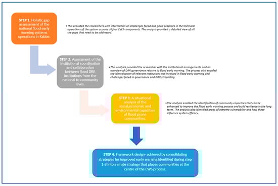 The study’s methodology is based on principles governing the IEMF [], which provide a structured view for hazard risk reduction by proposing strong interconnections between the operational/technical, institutional, and social elements across all governmental levels (Figure 1). As summarised in (Figure 3) The gap assessment (step 1) provided an overview of the operational/technical component of the EWS process. This includes information on flood data collection and analysis, real-time data availability, monitoring, forecasts and evaluation, warning generation, communication and dissemination. The institutional gap assessment (step 2) reviewed institutional collaboration and coordination between all relevant flood DRR stakeholders, including the degree of community engagement. This aspect also provided insight into flood EWS communication, dissemination, response, and their resulting influence on risk reduction in the study area. The gap assessment also sheds light on the often-disregarded sociocultural aspect of DRR, which determines the impacts sustained and community flood risk perceptions defined by differing exposure and experiences [].