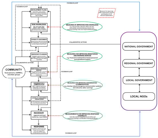 Ref. [] assert that tailoring EWS components to target communities’ needs is the key to building flood EWS efficacy. They argue that involving local authorities and communities in EWS design, implementation, and operation improves response to warnings and overall system efficacy. This framework demonstrates that addressing these elements is possible by strengthening and leveraging existing knowledge, resources and institutions using basic-but-effective and sustainable strategies to integrate top-down and bottom-up approaches. Regardless of the system’s deficits (e.g., technical, institutional, etc.), the strategy can be duplicated within any condition, enabling improved data and information-sharing capacities by directly linking existing technical and community capacities across all governmental levels. The end-user’s needs should define the parameters for system development, which should align with national policies and international standards. By merging top-down and community-centric approaches, the framework suggests that given the financial inability to fund DRR in developing countries adequately, governments should consolidate and exploit available tools and resources within existing governmental structures, partner institutions and communities to enhance the EWS process.