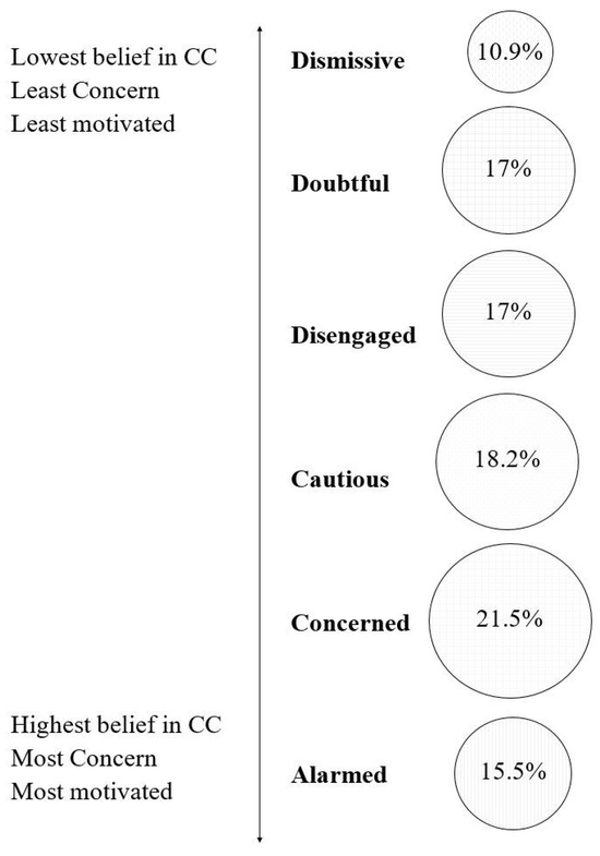 Proportion of participants in the Six Americas (CC) categories. (Note: Proportion is represented by area. CC = Climate Change).