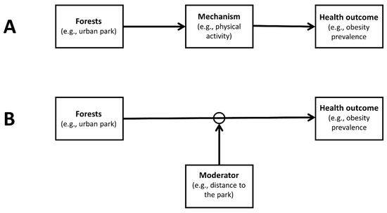 In high-income countries, many conceptual frameworks distinguish between two types of variables that can explain the effects of forests and urban greenspaces on human health outcomes: mechanisms (also known as mediators) and moderators (e.g., [9,10,11]). A mechanism is an intermediate outcome that lies on the causal pathway between forests and a human health outcome. Once affected by forests, a mechanism affects the health outcome (Figure 1A). For example, urban greenspaces can lead to increased physical activity, which in turn reduces obesity [64]. Physical activity is therefore a mechanism through which urban greenspaces affect obesity. A moderator, however, does not lie on a causal pathway but alters the magnitude or direction of the effects of forests on a health outcome (Figure 1B). For example, Coombes et al. [65] reported that people living closer to greenspaces were more likely to do more physical activity and less likely to be obese, suggesting that distance between homes and greenspaces can be a moderator of the effects of greenspaces on obesity. Differences between mechanisms and moderators have critical implications for the choices of study designs [66].