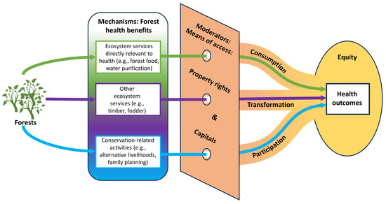 Forests have been increasingly recognized for their beneficial contribution to human health [1], in addition to their established roles in biodiversity conservation [2], climate change mitigation [3], and poverty alleviation [4]. Though forests are linked to some negative health outcomes, the effects of forests on human health are overwhelmingly beneficial [5]. Existing evidence, however, predominantly focuses on the psychological and physiological health benefits of recreational exposure to or experience of forests or greenspaces in urban communities in high-income countries. Evidence from rural low- and middle-income countries (LMICs) is scarce [5]. Yet, rural communities in LMICs are highly dependent on health benefits from natural resources because of limited access to health services and infrastructure [6]. Furthermore, the rates of forest degradation and deforestation are high in the rural areas of LMICs [7]. There is therefore a debate on how such communities can sustainably and equitably derive or enhance forest health benefits. The mere availability of forest resources does not necessarily translate into beneficial human health outcomes. Access to forest health benefits (e.g., forest food, improved water quality) is a requisite for these resources to have beneficial health impacts. To contribute to the debate, this paper discusses a constellation of interconnected factors that influence access to forest health benefits in rural communities in LMICs.