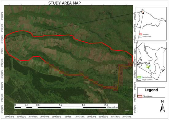 Kieni Forest is one of the forest zones that comprise the Aberdare Forest Ecosystem, located on the Aberdare Ranges (see Figure 1). It is managed by the Kenya Forestry Service (KFS). The Aberdare Ranges is one of Kenya’s five main water towers and supplies approximately 80% of the water used in Nairobi through the Ndakaini and Sasumua dams. The entire ecosystem spreads across four counties—Kiambu, Murang’a, Nyeri, and Nyandarua—with Kieni Forest located within Kiambu. Kieni Forest lies between 2200 m and 2684 m above sea level and receives rainfall of 1150 mm to 2560 mm annually [76]. The long rain season stretches from March to June, while short rains are received from October and December. Its soils are rich in organic matter, making them fertile and favourable to developing thick undergrowth. Its vegetation comprises natural forests, plantations, bamboo, meadows, and tea zones [77]. The replanted section covers an area of 269 ha and contains more than ten indigenous species, mainly Dombeya torrida, Juniperus processera, Olea africana, and Prunus africana. The crown diameters range from 0.4 m to 4.7 m, while the heights range from 0.75 m to 5.0 m. Being a reservoir of biodiversity, Kieni Forest also has a wide range of fauna, such as the African elephant (Lexodonta africana), duiker (Neottragus moschatus), Bush pig (Patomochoerus porcuso), and mongoose (Helogale parvula), among others [76,77].