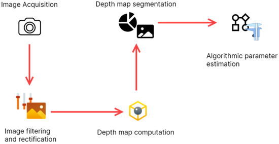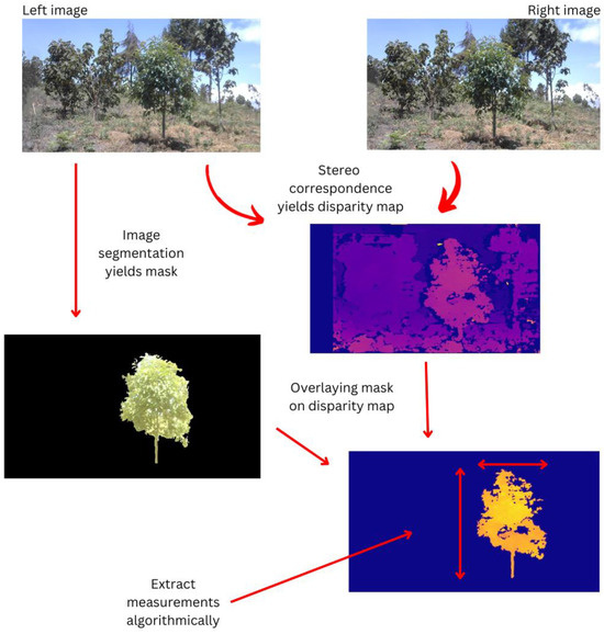 The process of extracting the tree attributes from the images happened in a series of steps captured in the workflow diagram shown in Figure 2. The images were first captured using a stereo camera and stored in the Jetson Nano kit. These images were then filtered to remove digital noise and then rectified. Rectification is a process performed to ensure the pair of images is correctly aligned. A new image known as a depth map is computed from the rectified images. Each pixel’s intensity in the depth map encodes the depth of that pixel relative to the stereo camera, making it possible to estimate the coordinates of all points in the depth map concerning the stereo camera. The depth is then segmented to retain only the object of interest, in this case a full tree or tree trunk, from which parameters such as diameter at breast height, crown diameter, and tree height are extracted algorithmically. Finer details about the algorithms used for computing the depth map and extracting the tree biophysical parameters are provided in Appendix A.