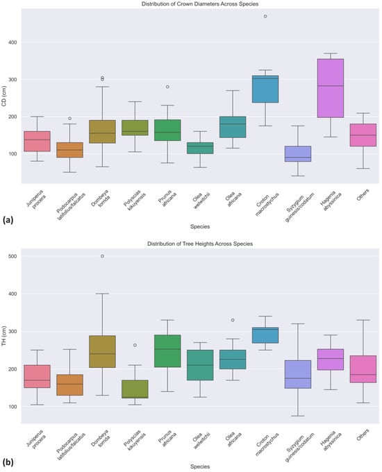 The distribution of the values of crown diameters and tree heights of trees in the study area is captured in the boxplots shown in Figure 4. Most species had their mean crown diameters falling from 100 to 200 cm. The species with the widest trees were Croton macrostychus and Hagenia abyssinica, with mean CD values of 291.25 cm and 270 cm. There were as many species with average heights in the 100 cm to 200 cm range as in the 200 cm to 300 cm range. The tallest trees were Croton macrostychus and Dombeya torrida, with mean TH values of 294.38 cm and 253.06 cm, respectively. The Dombeya torrida species had the largest outliers in tree heights, with trees as tall as 5 m.