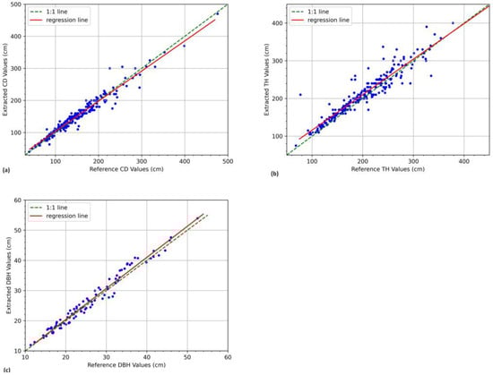 Regression plots comparing reference and extracted (a) DBH values, (b) CD values, and (c) TH values.