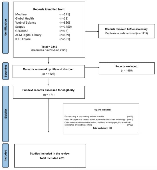 Searches were conducted in the following electronic databases using date parameters 1 January 2008 and 20 June 2022: Ovid Medline, Global Health, Web of Science, Scopus, Geobase, ACM Digital Library, and IEEE Xplore. The start date reflects Satoshi Nakamoto’s paper on Bitcoin and the first successful implementation of blockchain technology in 2008 [16]. Key terms relating to planetary health and blockchain were informed by previous reviews [6,17], including terms relating to global health, one health, environmental health, healthcare financing, the social determinants of health, population health, health equity, ecology and health, and climate change and health; and blockchain, web3, distributed ledger, and cryptocurrency. Supplement Table S1 provides the full search strategy for each respective database search.