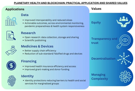 A visual summary of the results is shown in Figure 2. Blockchain can be applied to practical planetary health challenges and use cases in a number of ways, across data, financing, identity, medicines and devices, and research. Values-based considerations that emerged in the data include equity, decentralisation, transparency and trust, and managing complexity.