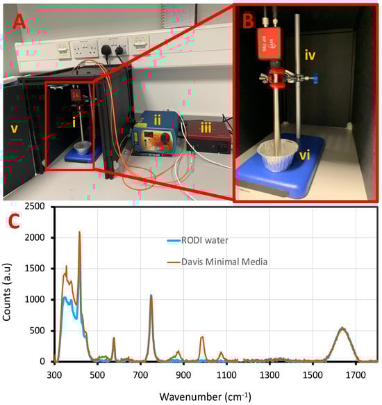 Aluminium foil cups were used as sample holders to reduce background interference from the sample container. A sample volume of not less than 3 mL was used for each measurement. The height of the Raman probe was carefully adjusted to allow right exposure to the sample without touching the sides or the sample holder bottom (shown in Figure 1). A black box (Thorlabs XE25C7/M; Newton, NJ, USA) equipped with an emergency laser power interlock switch was used as an enclosure for laser safety during the experiments. Throughout the experiments, Enlighten Software version 2.7.3 (WP) was used for collecting the spectral data. In Figure 1C, an example Raman spectra of DMM and RODI water obtained with the Raman probe set-up is shown. It is evident from the Raman peaks in the shaded regions of the Figure 1C that these peaks are common to both DMM and RODI media. Raman peaks in the left hand shaded region (between the spectral regime of 300 cm−1 to 800 cm−1) corresponds to sapphire ball lens in the Raman probe are shown []. On the other hand, the Raman peaks in the right-hand shaded region (between the spectral regime of 1200 cm−1 to 1800 cm−1) corresponds to water.